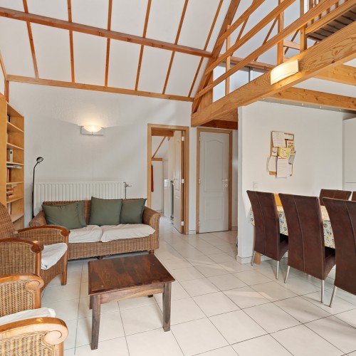 Beim Betreten des Hauses gelangen Sie zunächst in das Wohnzimmer, das mit einem gemütlichen Ofen und einem Esstisch ausgestattet ist. Daneben befindet sich eine geräumige, offene Küche.