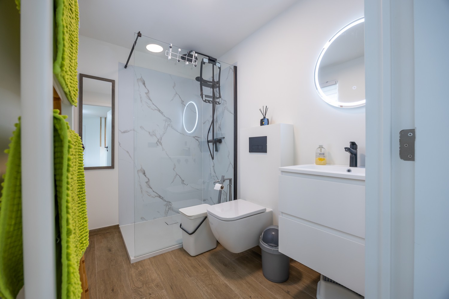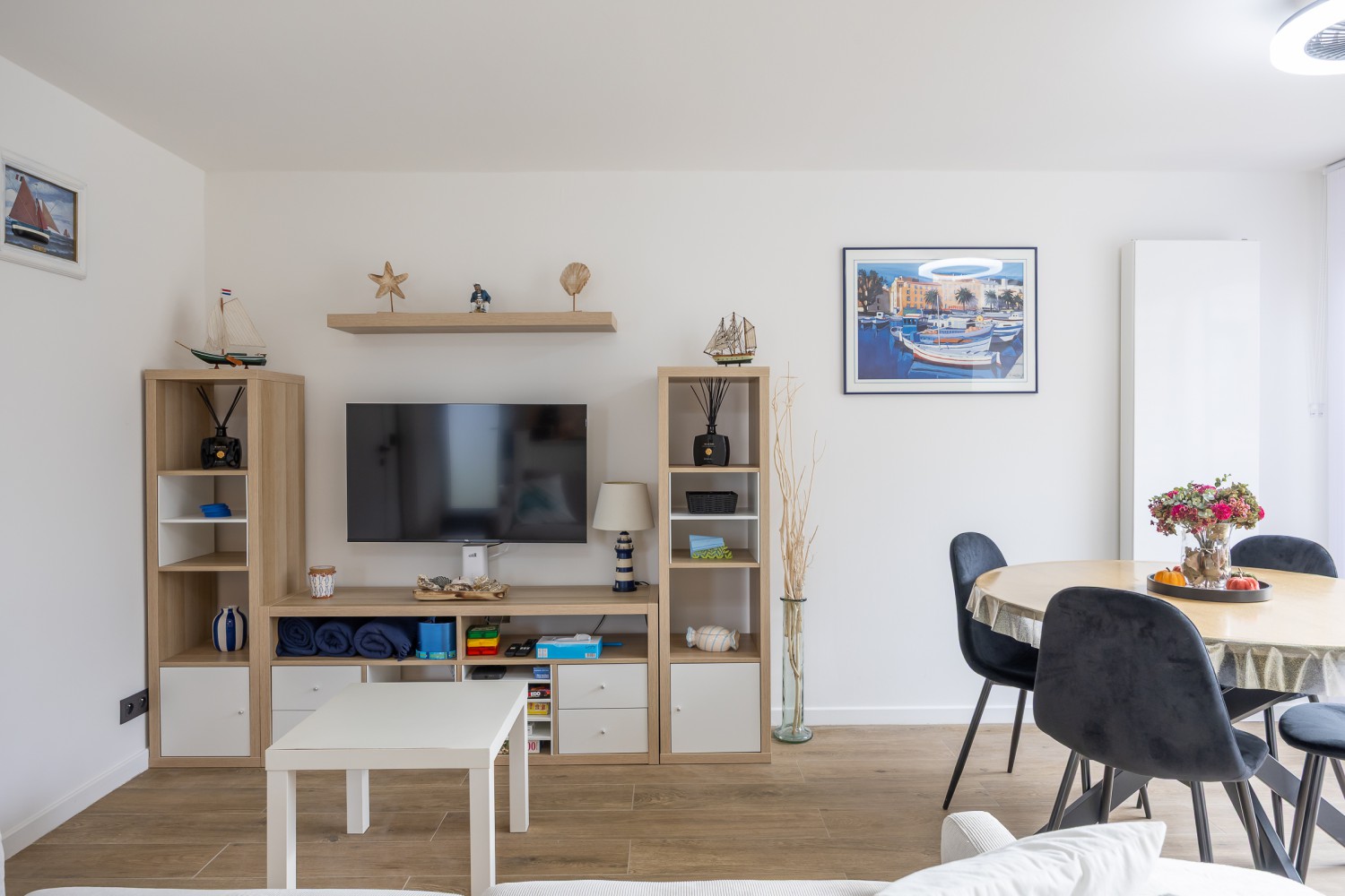 The bright living area includes a sofa bed for two people and an open kitchen equipped with all necessary appliances. From the living room, you can access the sunny terrace and fully fenced garden, where you can enjoy privacy and quiet moments outdoors.