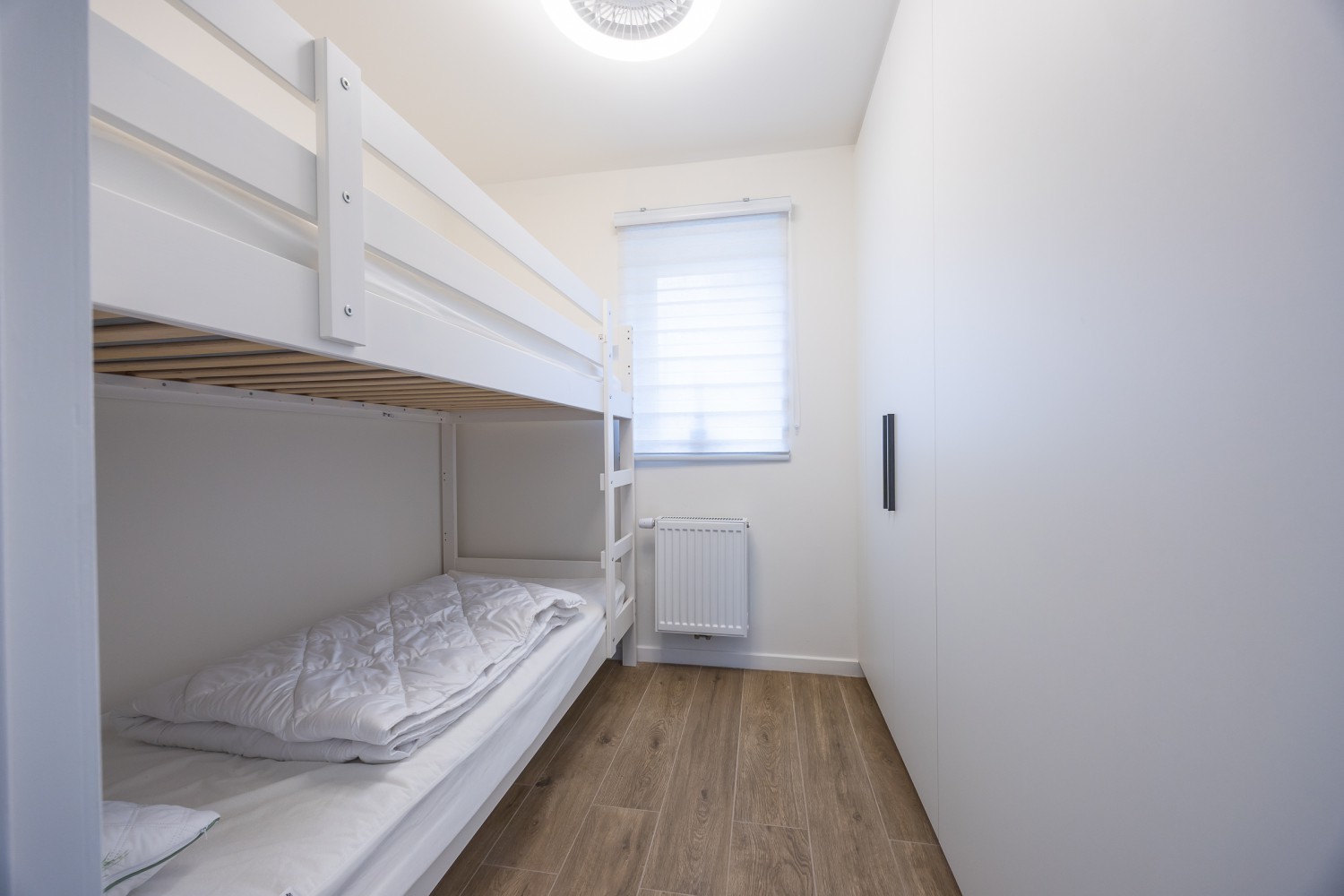 The bungalow features two full bedrooms with built-in wardrobes: one with a double bed, and one with a bunk bed. The modern bathroom includes a walk-in shower and toilet.