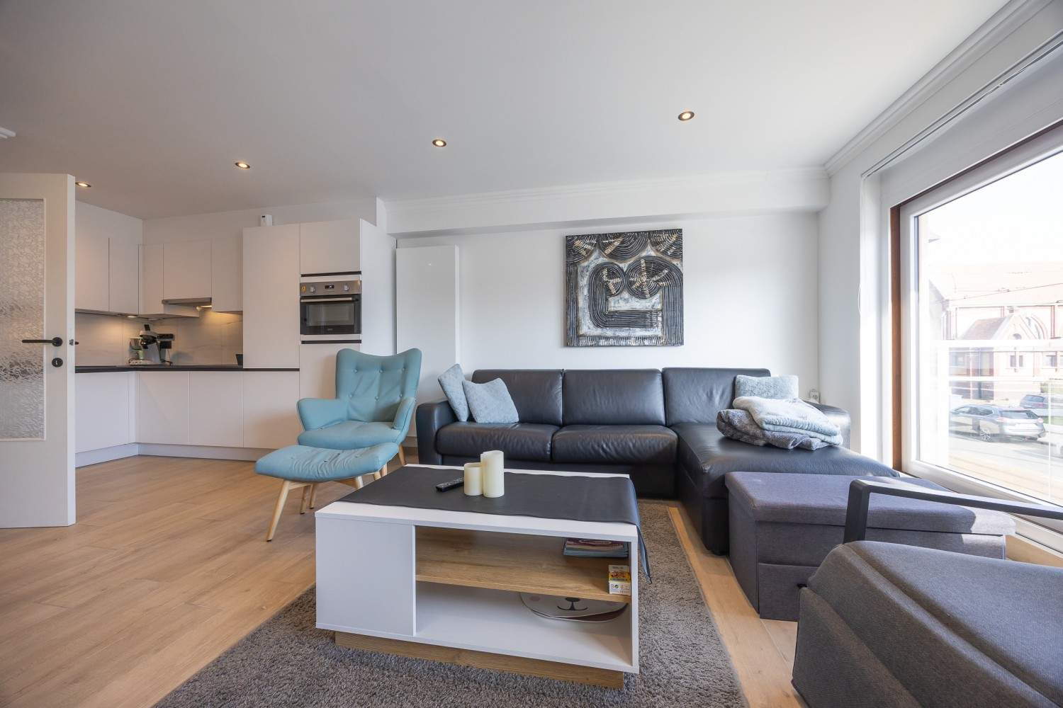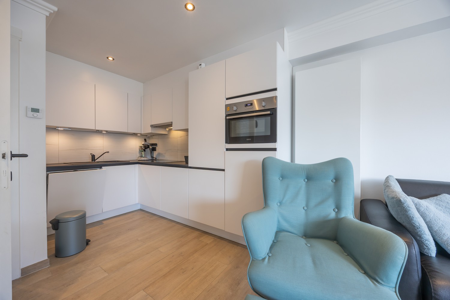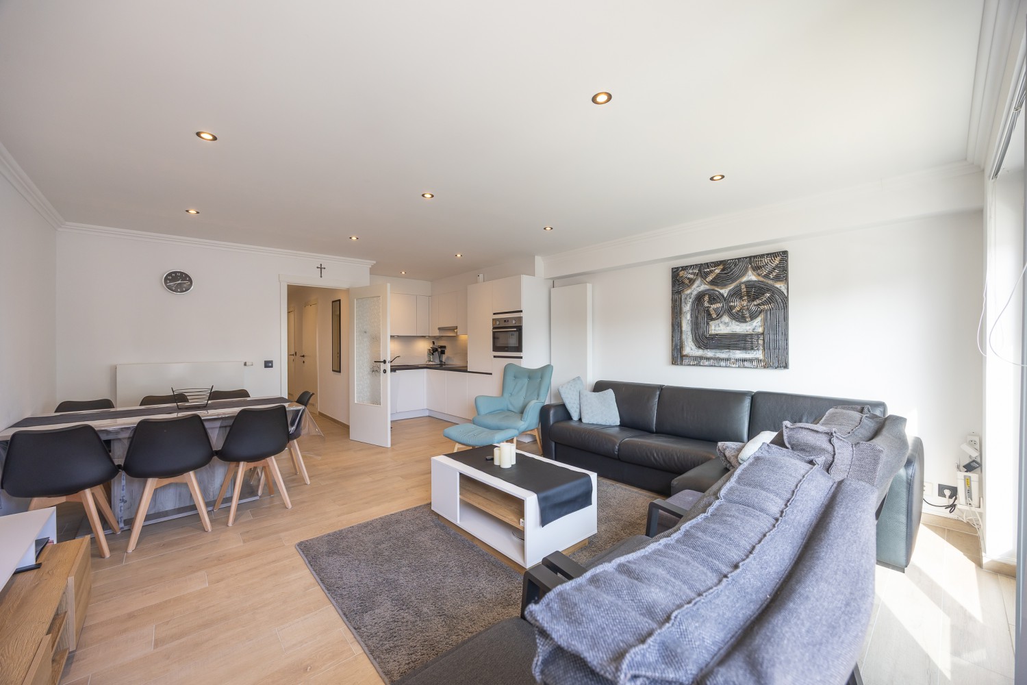 Le salon élégant et lumineux bénéficie d’une abondante lumière naturelle grâce aux baies vitrées toute hauteur et donne accès directement à la terrasse ensoleillée. La cuisine ouverte entièrement équipée s’intègre parfaitement à l’espace de vie et invite à cuisiner et partager de bons moments ensemble.