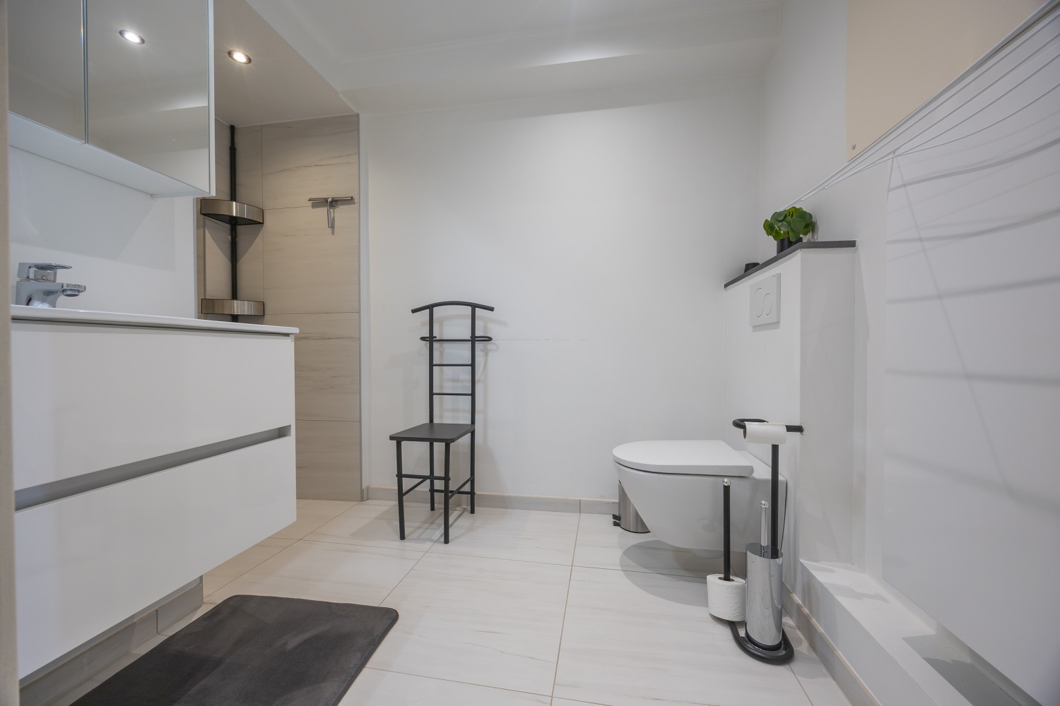 Vous y trouverez également une salle de bain moderne avec grande douche à l’italienne et toilettes ainsi qu’un débarras pratique avec machine à laver. L’aménagement chaleureux et contemporain et les finitions de qualité garantissent un séjour agréable et relaxant.