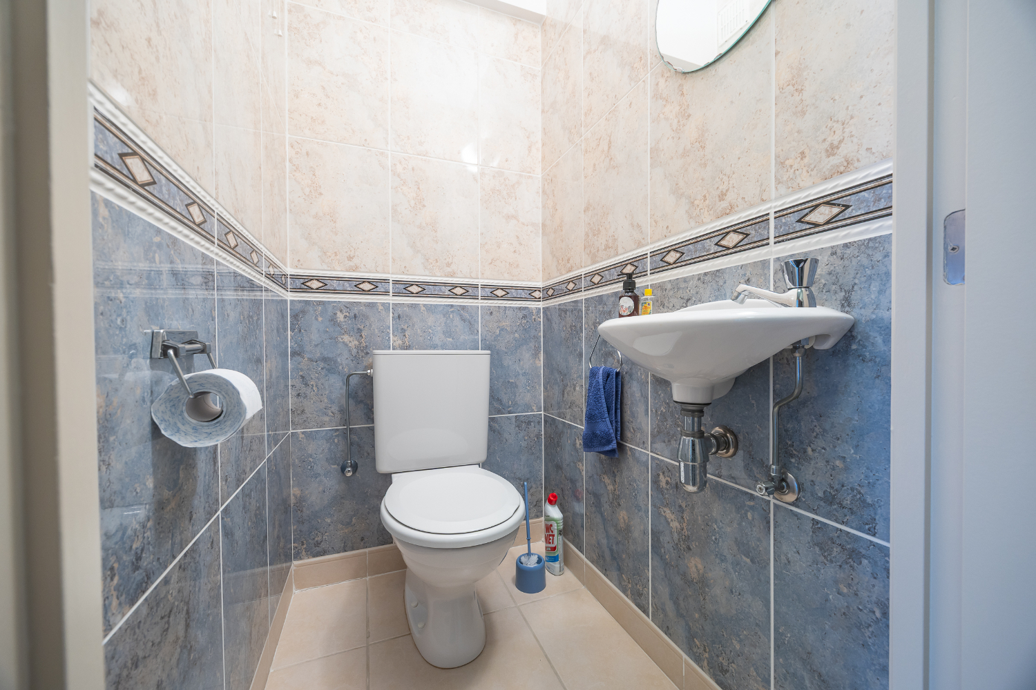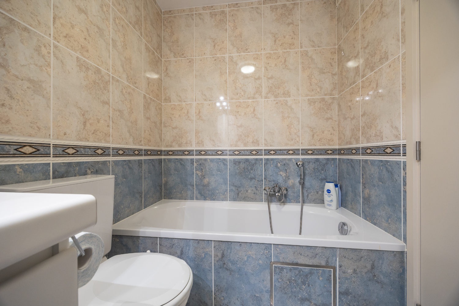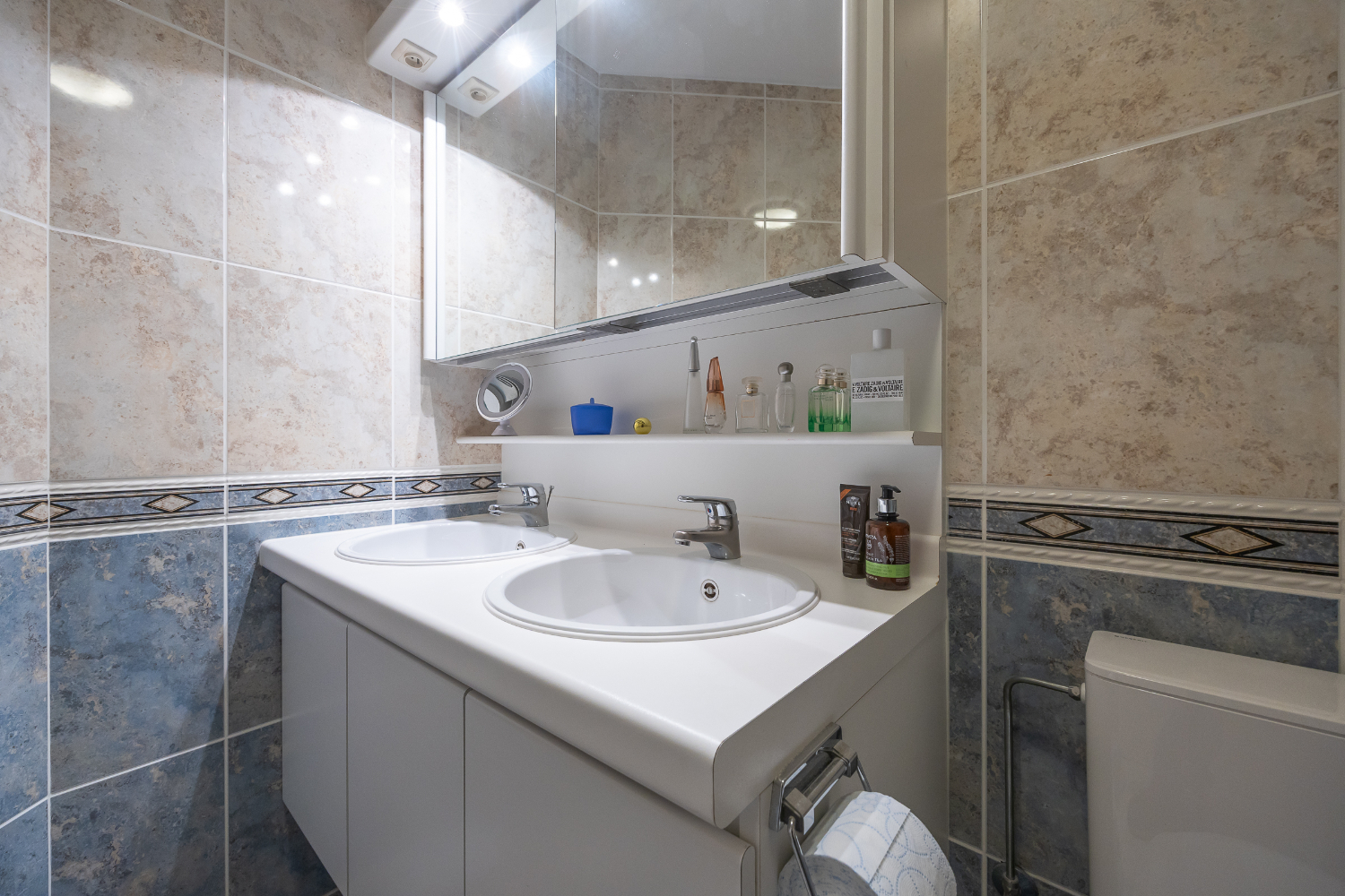 De badkamer beschikt over een ligbad met douchemogelijkheid, een dubbele lavabo en een toilet. Daarnaast is er een apart gastentoilet, wat extra praktisch is bij ontvangst van familie of gasten.