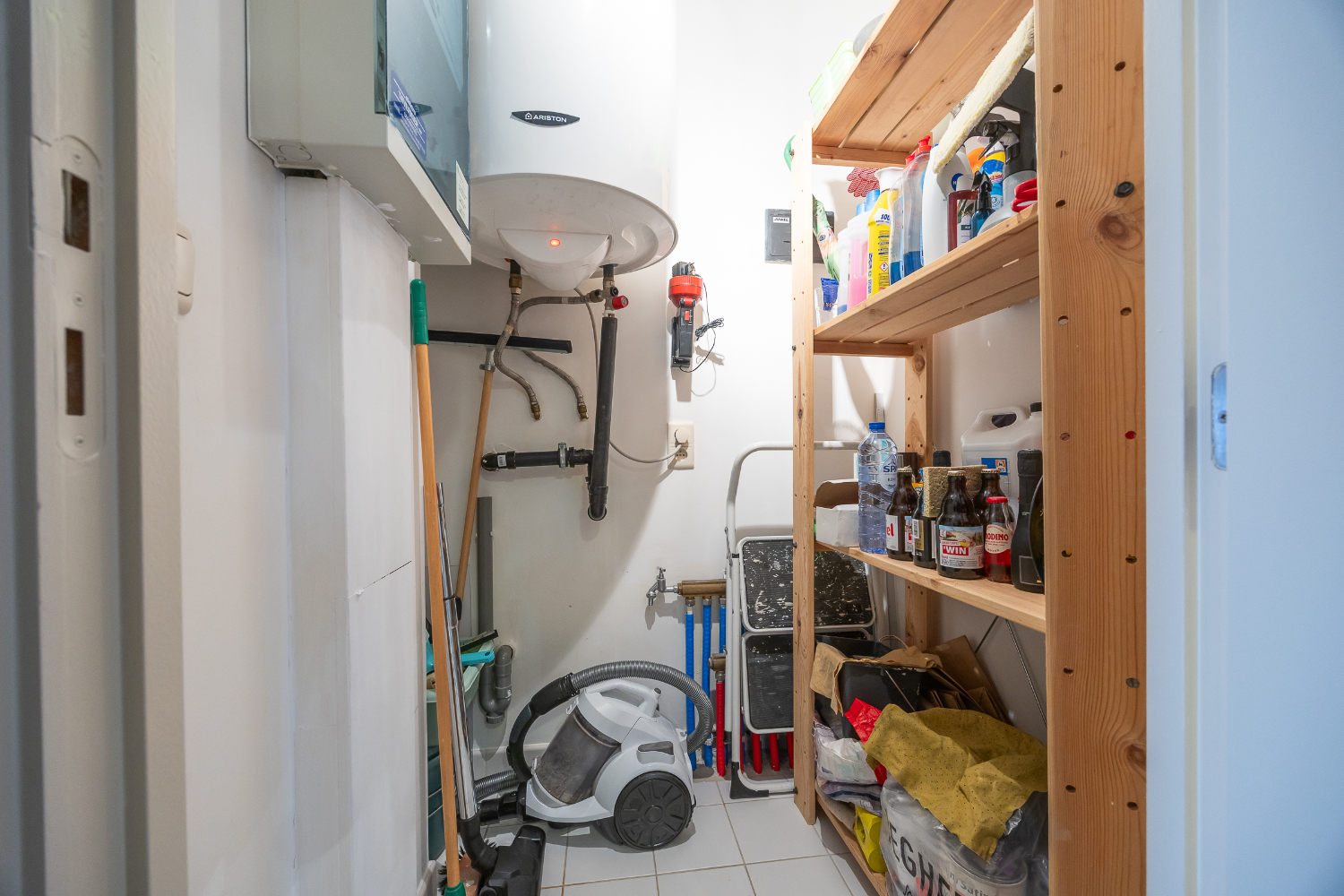De geïnstalleerde keuken is uitgerust met alle nodige toestellen en biedt het comfort om zorgeloos te koken en te genieten. Aansluitend bevindt zich een handige berging met aansluiting voor een wasmachine, wat het dagelijks comfort verhoogt.