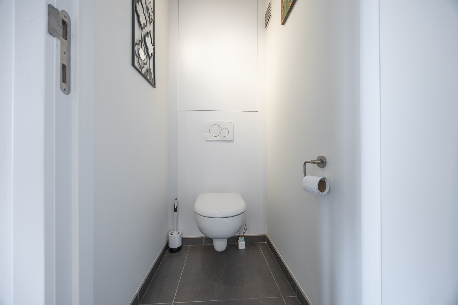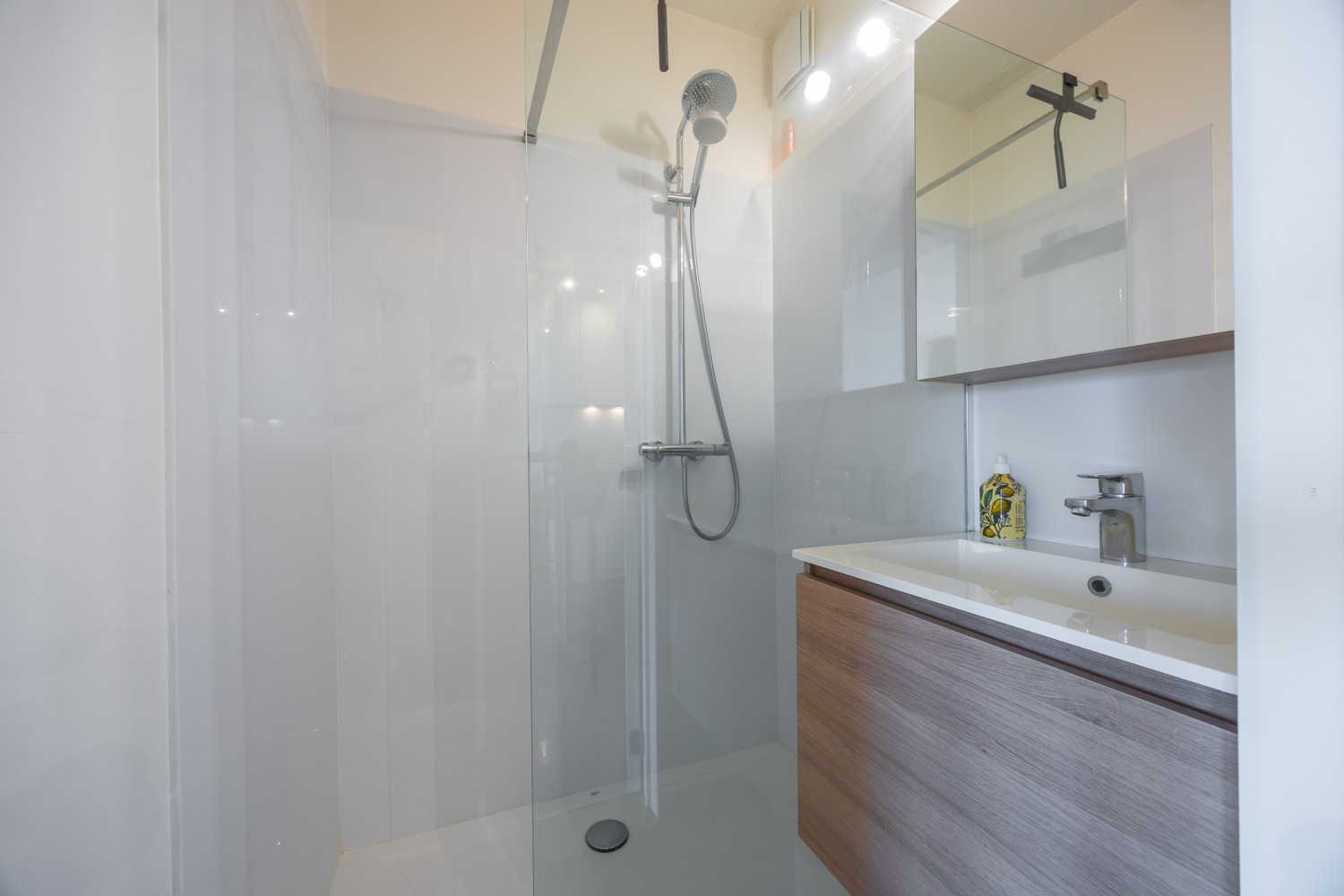 De moderne badkamer met douche biedt alle hedendaags comfort en is afgewerkt met kwalitatieve materialen, perfect om fris aan de dag te beginnen of te ontspannen na een strandwandeling.